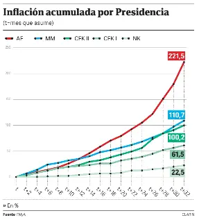 Desde el 2003 en adelante, cada periodo presidencial trajo consigo un escalón más alto para la inflación. Cuando Néstor Kirchner cumplió los 1.000 días, el índice de precios llegó a 22,5%. En en mismo lapso del primer mandato de Cristina Kirchner, la inflación acusó 6,5%. Y en su segundo mandato saltó a 100,7%.