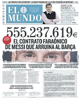 La tapa es impactante. “El contrato faraónico de Messi que arruina a Barca”, dice el titular, que es acompañado por el no menos impactante número 555.337.619 de euros . “Es el mayor contrato de la historia del deporte”, aseguran. Y dejaron trascender fotocopias del contrato original firmado por la Pulga.